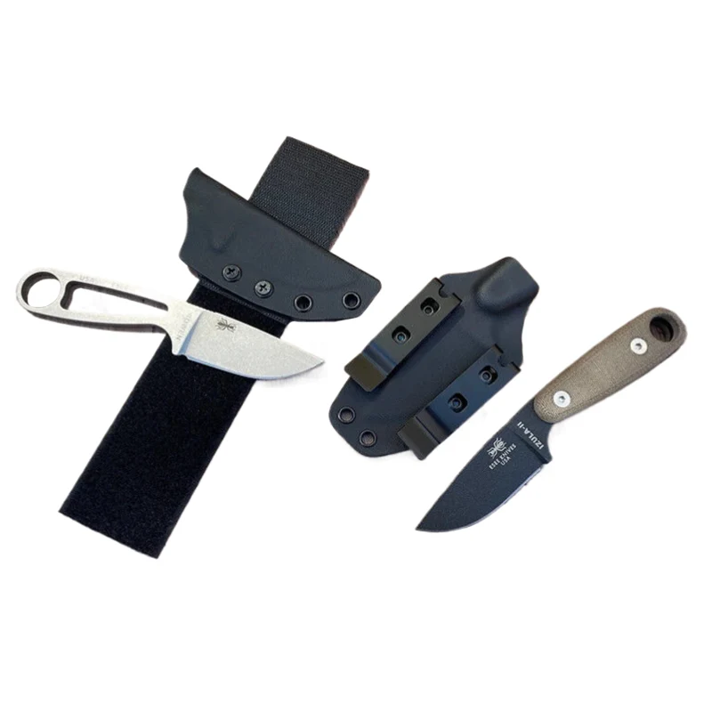 शिकार चाकूला क्लासिक पद्धतीने पट्ट्याशी जोडण्यासाठी, क्षैतिज किंवा अनुलंब, माझे ग्राहक सहसा मल्टी-लोक निवडतात. जर तुम्हाला चाकू थोडा खाली ठेवायचा असेल, तर मी Kydex धारकासह नायलॉनचा पट्टा वापरण्याची शिफारस करतो. चाकू पट्ट्यामध्ये नेण्यासाठी क्लिप किंवा वेल्क्रो आदर्श आहेत. बॅकपॅकच्या पट्ट्याला चाकू जोडण्यासाठी वेल्क्रो देखील एक व्यावहारिक उपाय आहे. Kydex म्यान व्यतिरिक्त, मी फायर स्टील धारक जोडू शकतो, वैकल्पिकरित्या फायर स्टील (80 मिमी लांब) सह. सामान्य, निःशब्द रंगांमध्ये उपलब्ध आहे जसे की: तपकिरी, कोयोट तपकिरी, वाळू आणि ऑलिव्ह. तुम्हाला इतर रंग, नमुने, तुमच्या Kydex शीथसाठी तुमच्या स्वतःच्या इच्छा किंवा माझ्यासाठी काही प्रश्न असल्यास, फक्त मला लिहा.